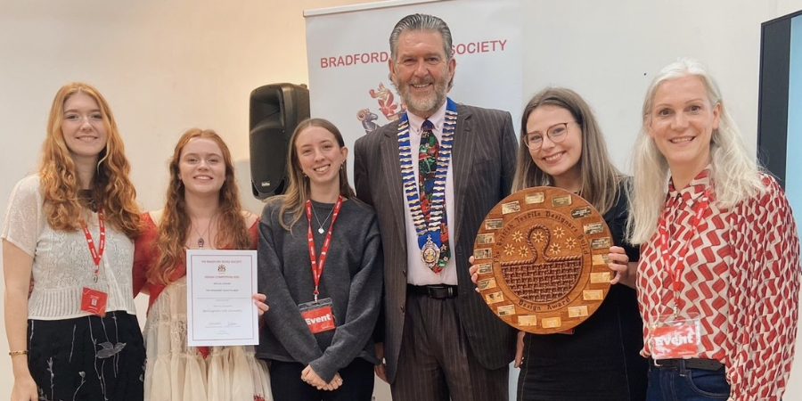 Pictured (from left):Â Sophie Tuck (2025 Graduate), Alice Morton (2025 Graduate), Lara Gembarska (Final-Year Student), Malcolm Campbell (President of Bradford Textile Society), Amy Newton (2025 Graduate), and Clare Langford (Senior Lecturer).